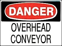 Danger Overhead Conveyor signs are available in a variety of materials,...Aluminum,..... Fiberglass,...Rigid Plastic,...Pressure Sensitive Vinyl, and Magnetic. Standard sizes include...3"x5",.. .7"x10", ...10"x14" and 14"x 20". Signs up to 48" x 48" are available.