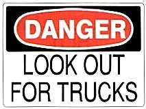 Danger Look Out For Trucks signs are available in a variety of materials,...Aluminum,..... Fiberglass,...Rigid Plastic,...Pressure Sensitive Vinyl, and Magnetic. Standard sizes include...3"x5",.. .7"x10", ...10"x14" and 14"x 20".